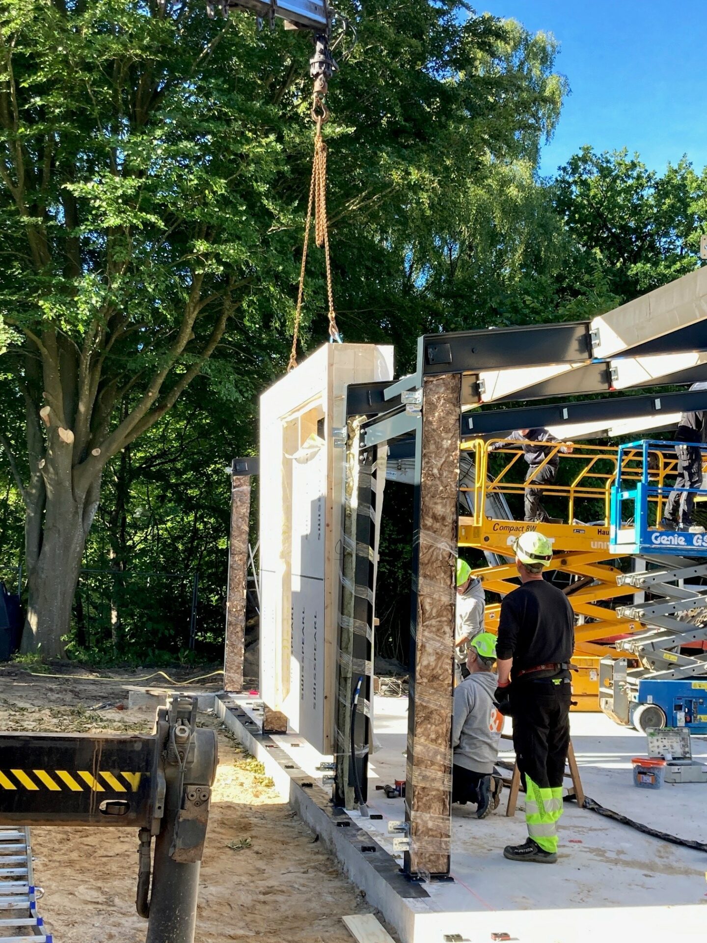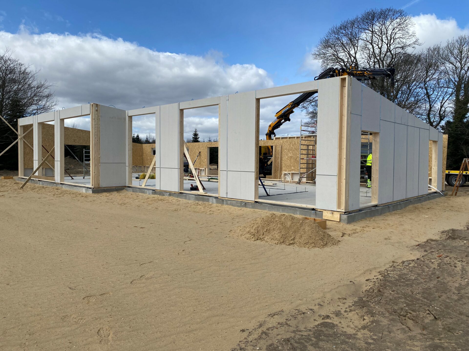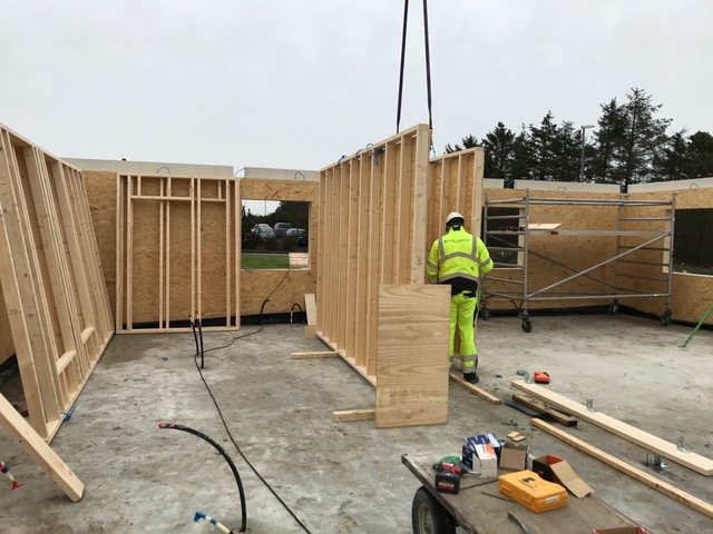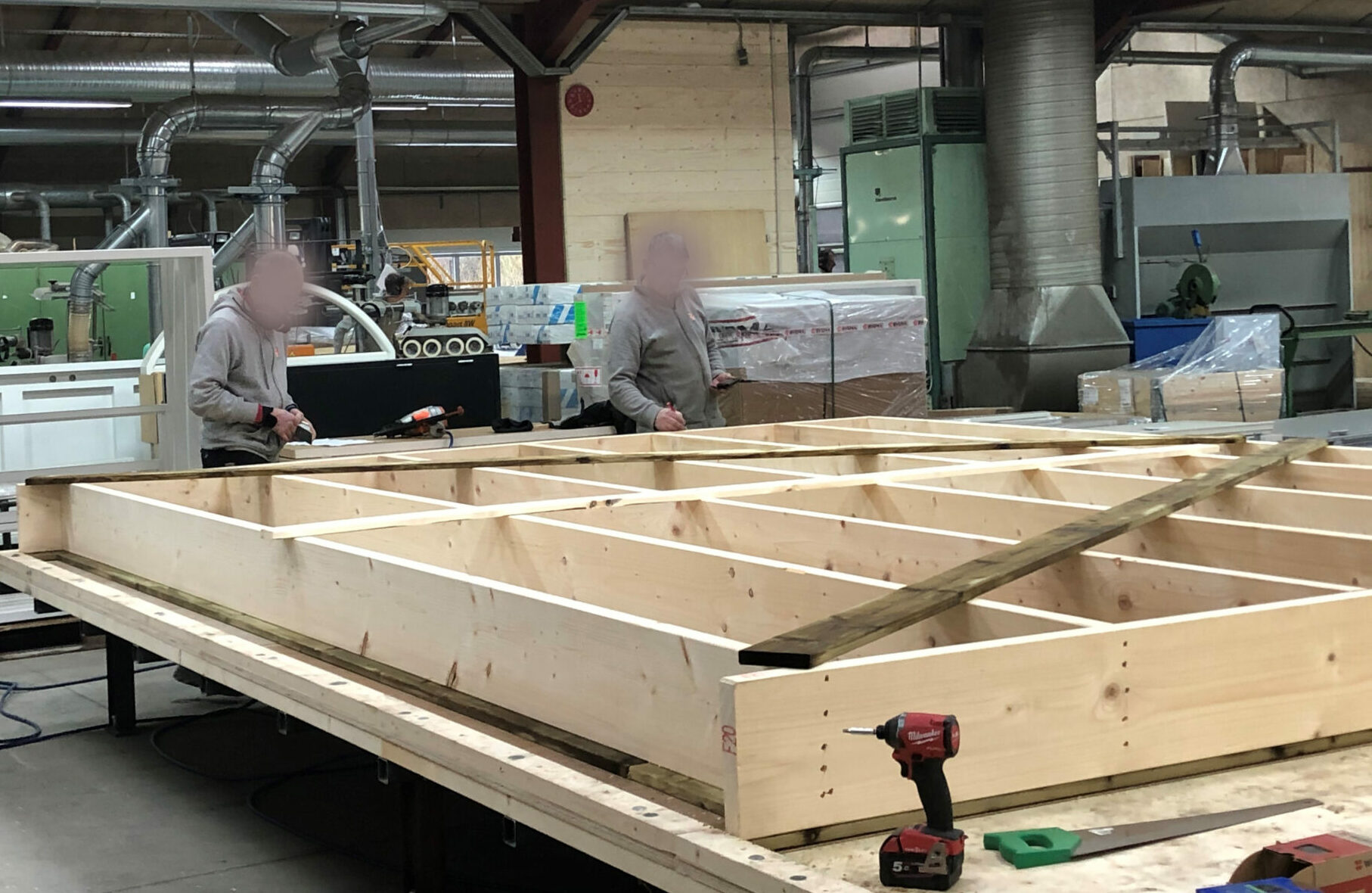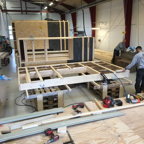 Træelementerne produceres på vores værksted med isolering, dampspærre mv. i moduler. Derefter læsses de på kranbil, og kranes derefter direkte på fundamentet på byggepladsen, og skillevæggene placeres ligeledes.