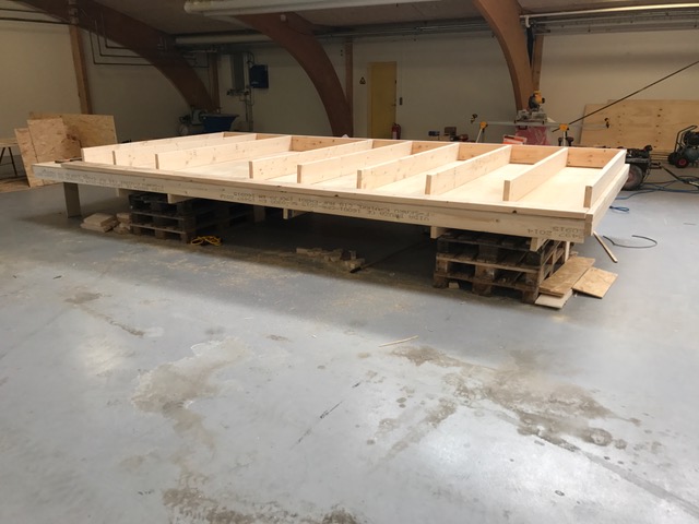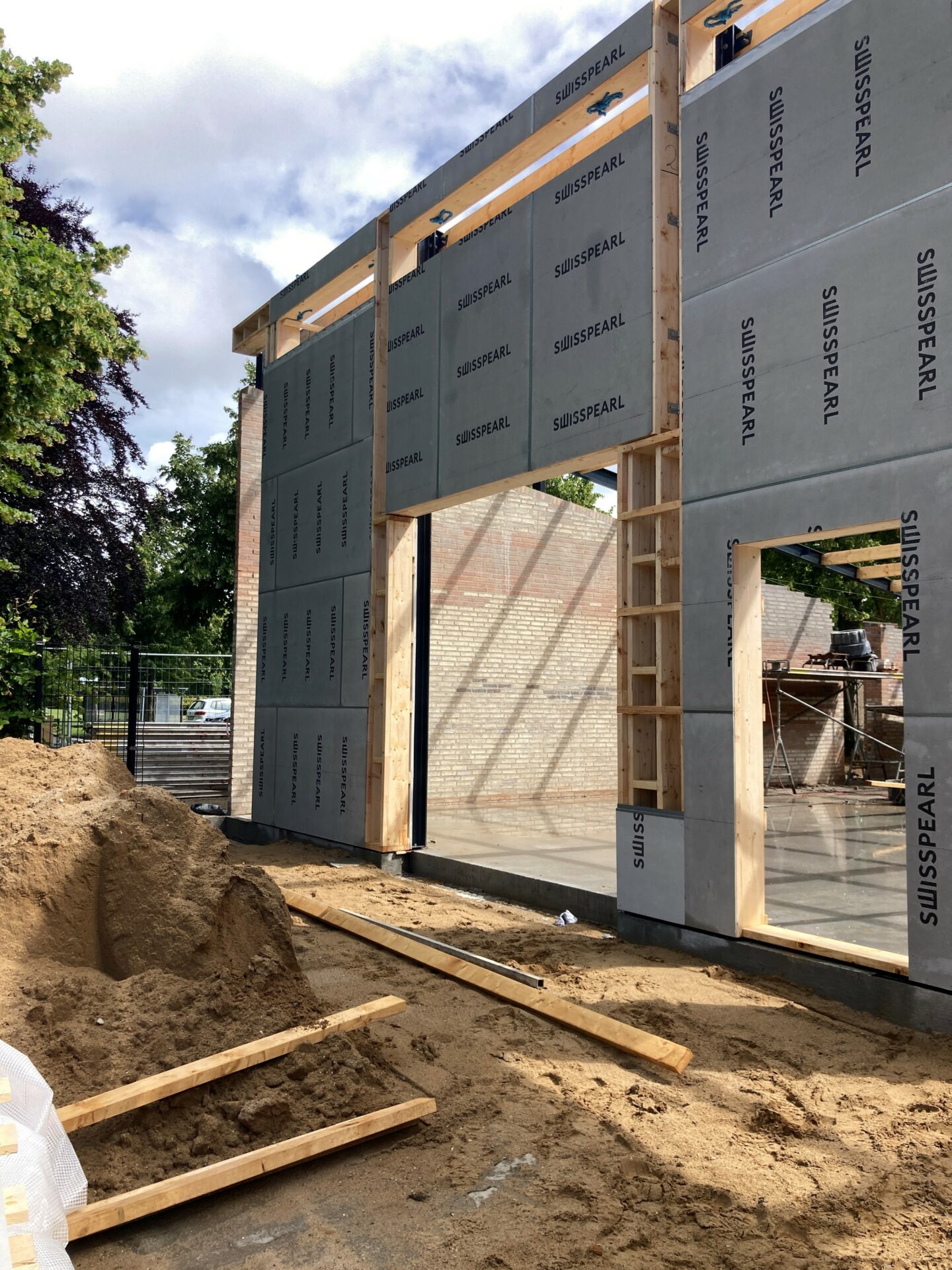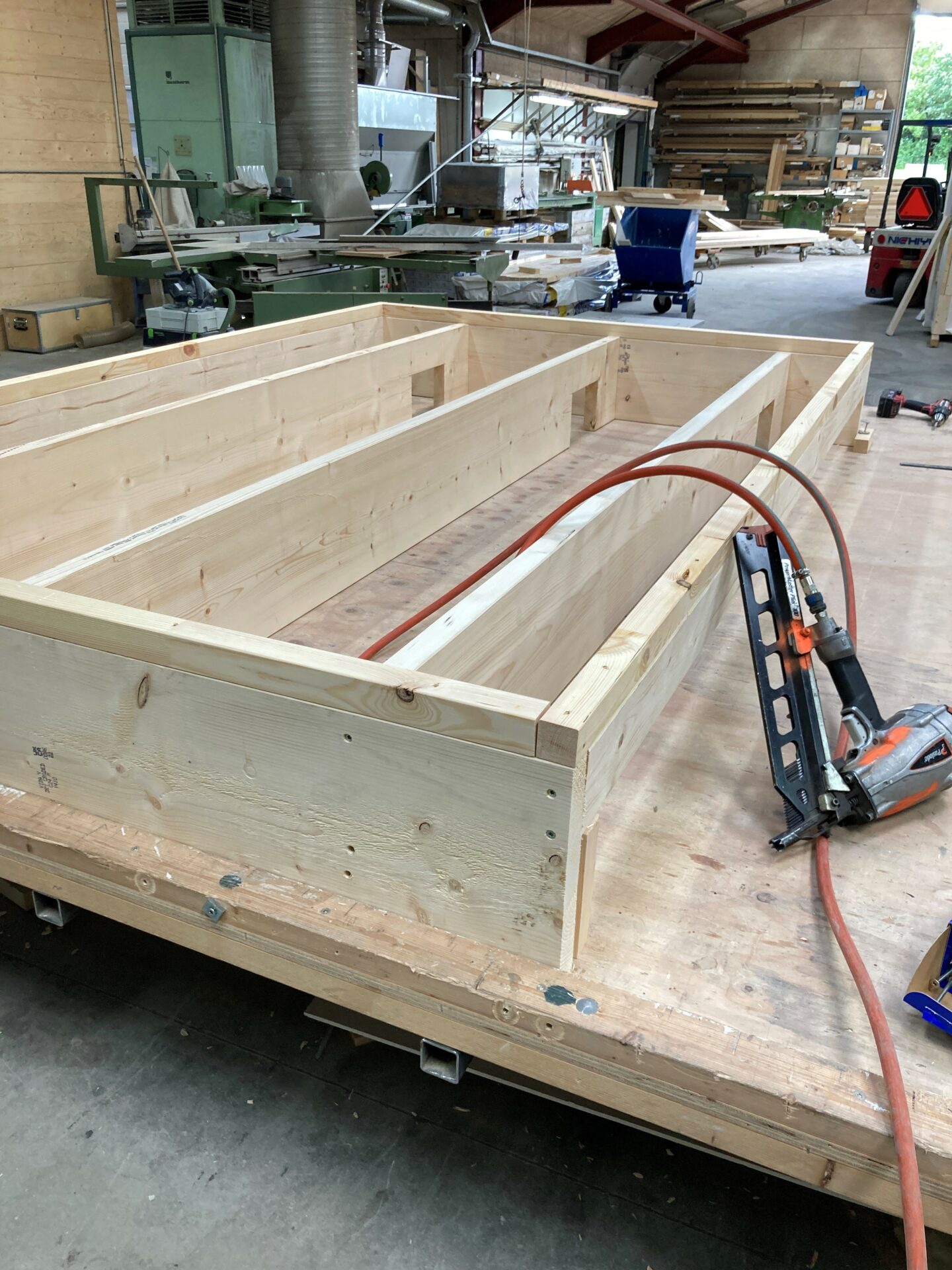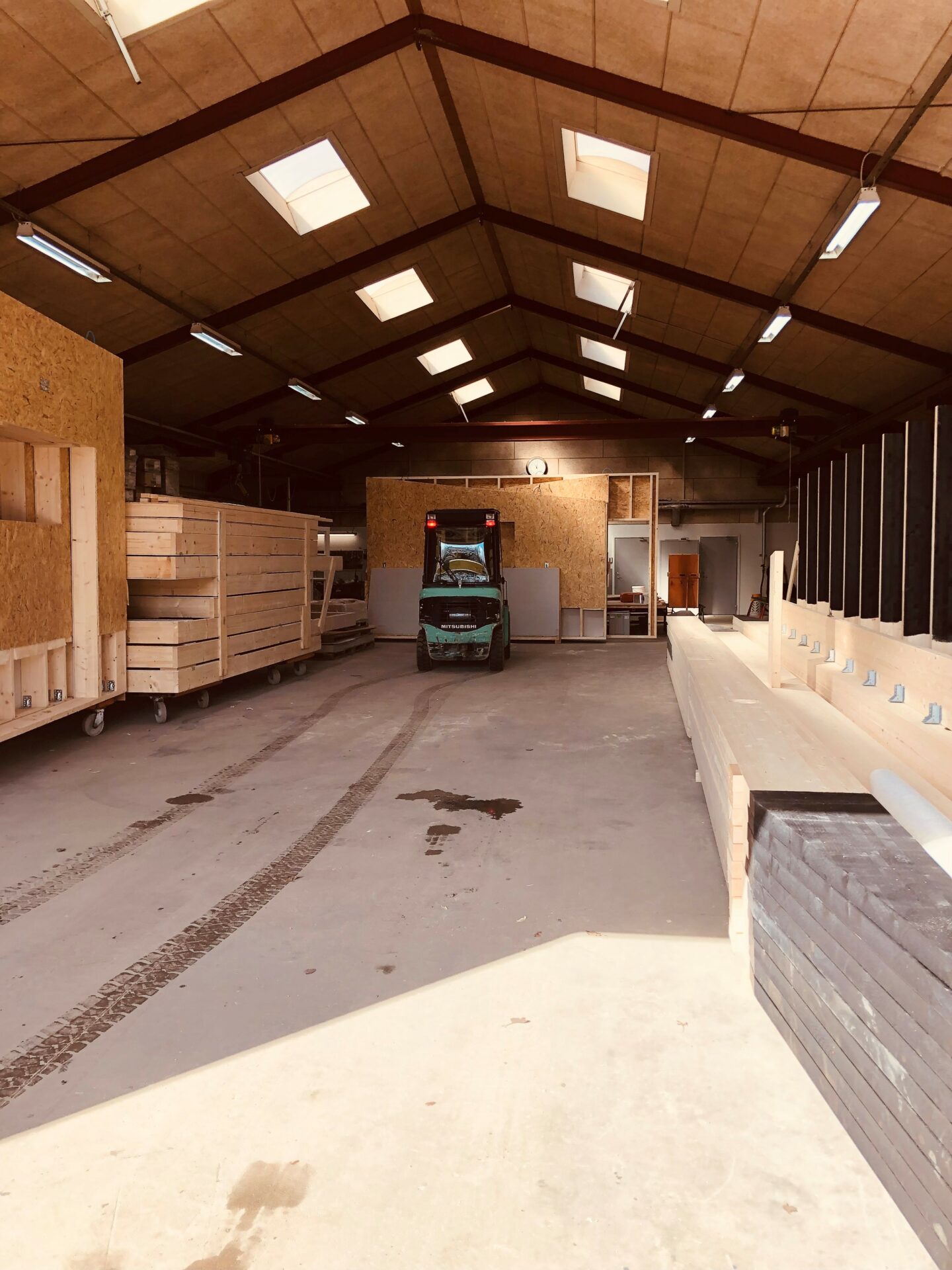 Træelementerne produceres på vores værksted med isolering, dampspærre mv. i moduler. Derefter læsses de på kranbil, og kranes derefter direkte på fundamentet på byggepladsen, og skillevæggene placeres ligeledes.